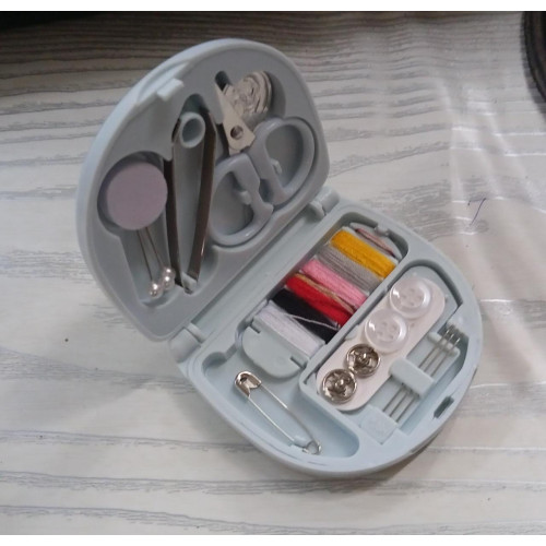 - All in One Sewing Box : Each pack of sewing kits, with light pink and light blue colors. Each case includes 3 x straight pins, 3 x hand needles, 1 x small scissor, 1 x needle threaded, 1 x safety pin, 2 x pearlized buttons, 2 x snaps, 1 x tweezers and 1 x six color thread board.